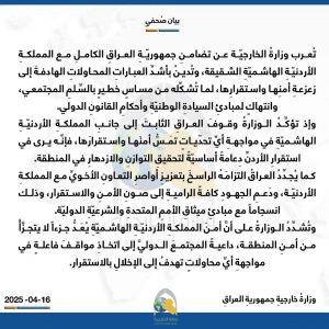 عربي ودولي العراق يتضامن مع الأردن: أمن المملكة الأردنية الهاشمية جزء لا يتجزأ من أمن المنطقة 16 أبريل، 202516 أبريل، 2025 steam1 460 Views