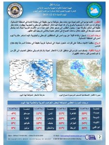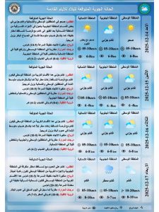 نشرت هيئة الأنواء الجوية تقريرها لتوقعات حالة الطقس، مشيرة إلى استمرار الأمطار بشكل متفاوت حتى يوم الأربعاء المقبل