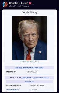 السياسية عربي ودولي ترامب يعلن نفسه حاكما مؤقتا لفنزويلا 12 يناير، 2026 steam1 32 Views أعلن الرئيس الأمريكي دونالد ترامب، في منشور عبر منصة “تروث سوشيال” نفسه حاكما مؤقتا لفنزويلا.